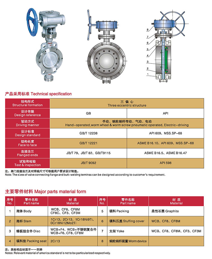 三偏心蝶閥,被廣泛用于介質(zhì)溫度≤425℃的冶金 、電力、石油化工、以及給排水和市政建設(shè)等工業(yè)管道上,作調(diào)節(jié)流量和載斷流體使用。其主要特點(diǎn)有耐高溫、必須使用硬密封、但泄漏量大;要零泄漏、必須使用軟密封、卻不耐高溫。為克服雙偏心蝶閥這一矛盾、又對(duì)蝶閥進(jìn)行了第三次偏心。而所謂第三次偏心,就是密封副的形狀不是正錐,而是斜錐。